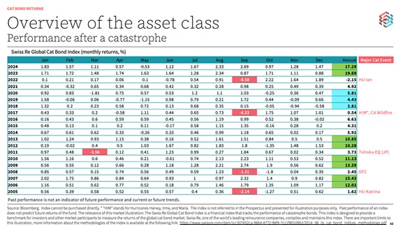 A continuación, se muestra una tabla con las rentabilidades del sector de cat bonds elaborada por SwissRe.